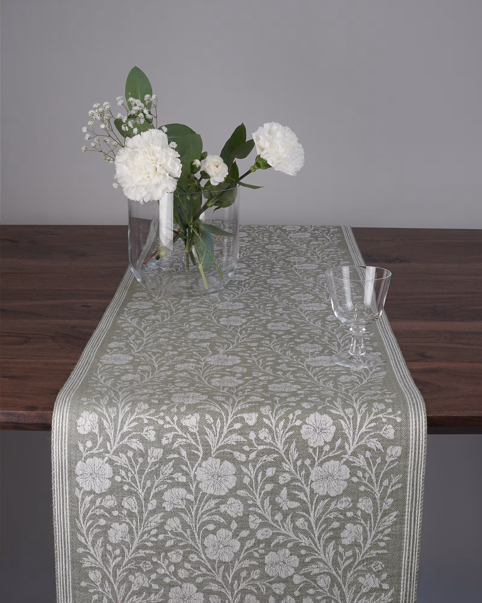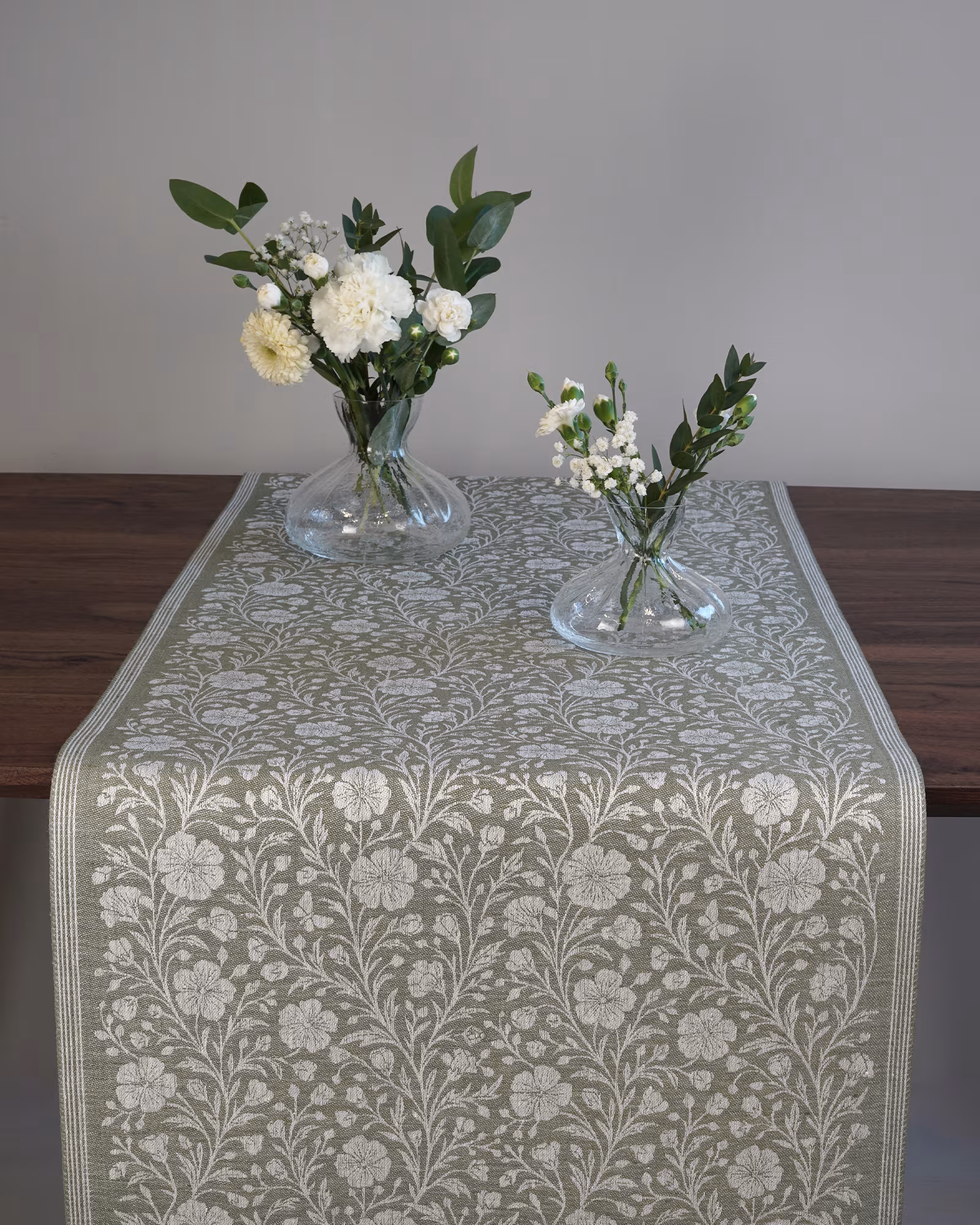 The table runner is woven from high-quality linen in Klässbol, where a long tradition of craftsmanship and material knowledge characterizes every step of the process. The rhythm and density of the pattern is adapted to the shape of the runner, which means that it adds life and structure to the table without dominating.