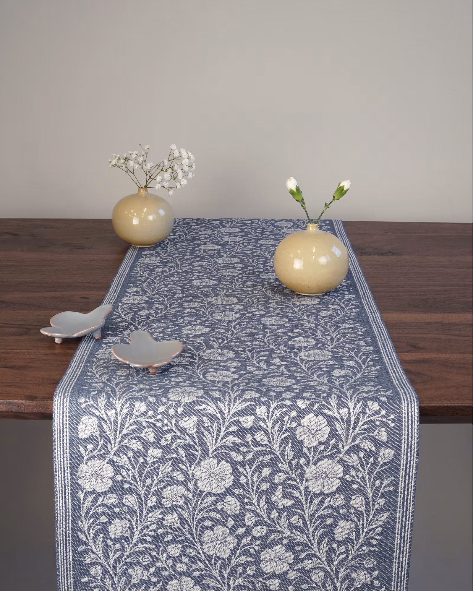 Blååker is a linen runner that takes its starting point from line 's own flower and the landscape where it grows. Designed by Hanna Wendelbo and woven in Klässbol, this is a runner with a quiet expression – created for table settings where the material and the whole are allowed to speak.