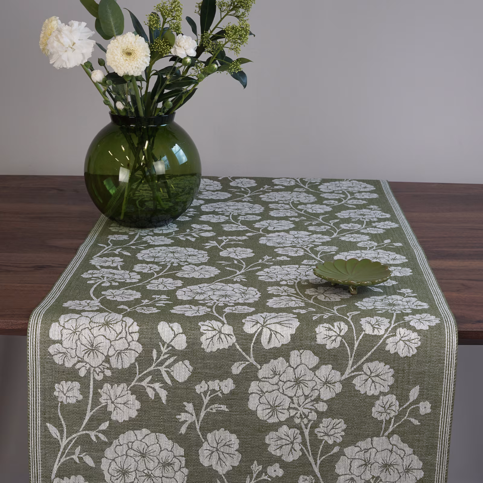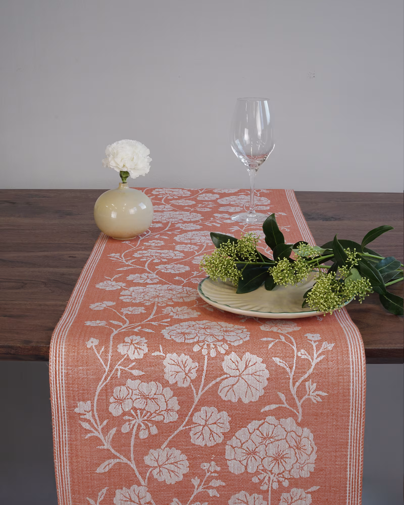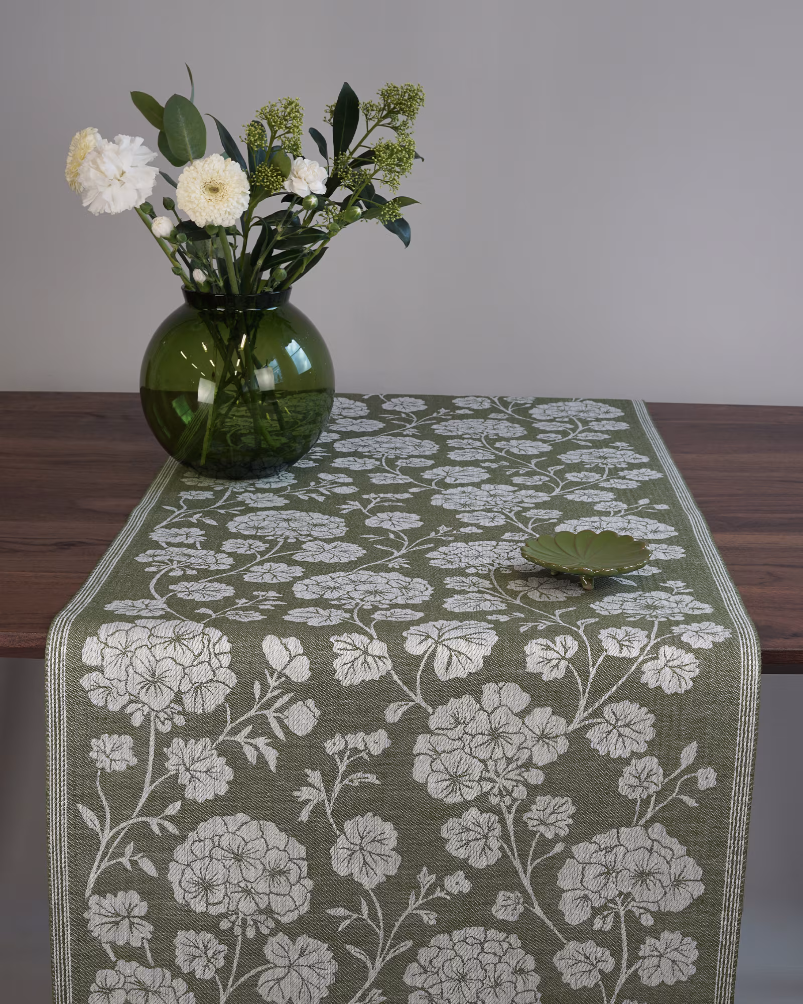 Mårbacka pelargon is created for everyday table settings as well as for more formal occasions. A runner that adds pattern and warmth without taking over, and that over time becomes softer, more beautiful and increasingly personal.