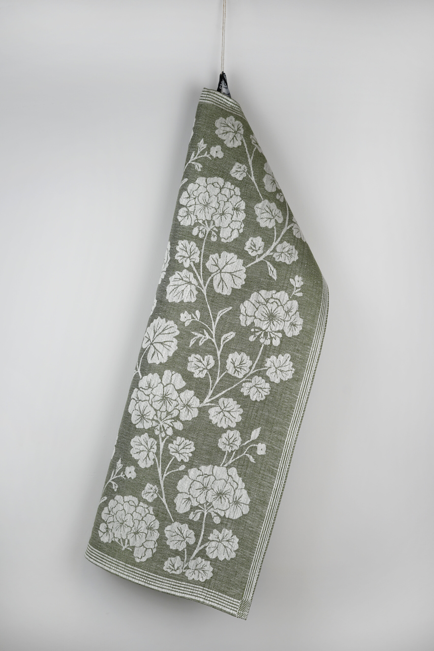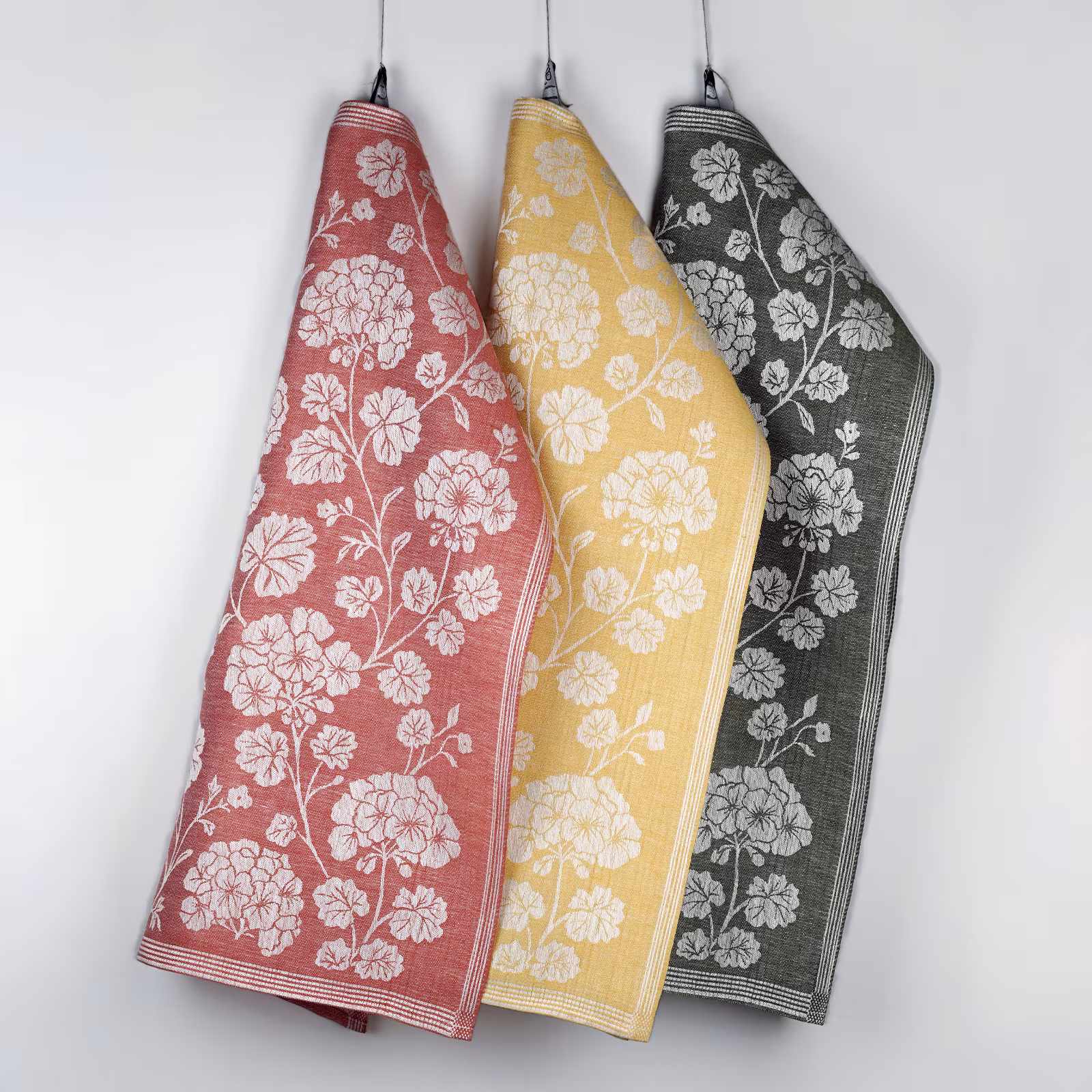 Mårbacka pelargon – a towel for everyday moments. Mårbacka pelargon is a linen towel where everyday function meets a pattern filled with a homely feel. Designed by Hanna Wendelbo and woven in Klässbol, this is a towel that combines the familiar expression of geranium with the timeless quality of line