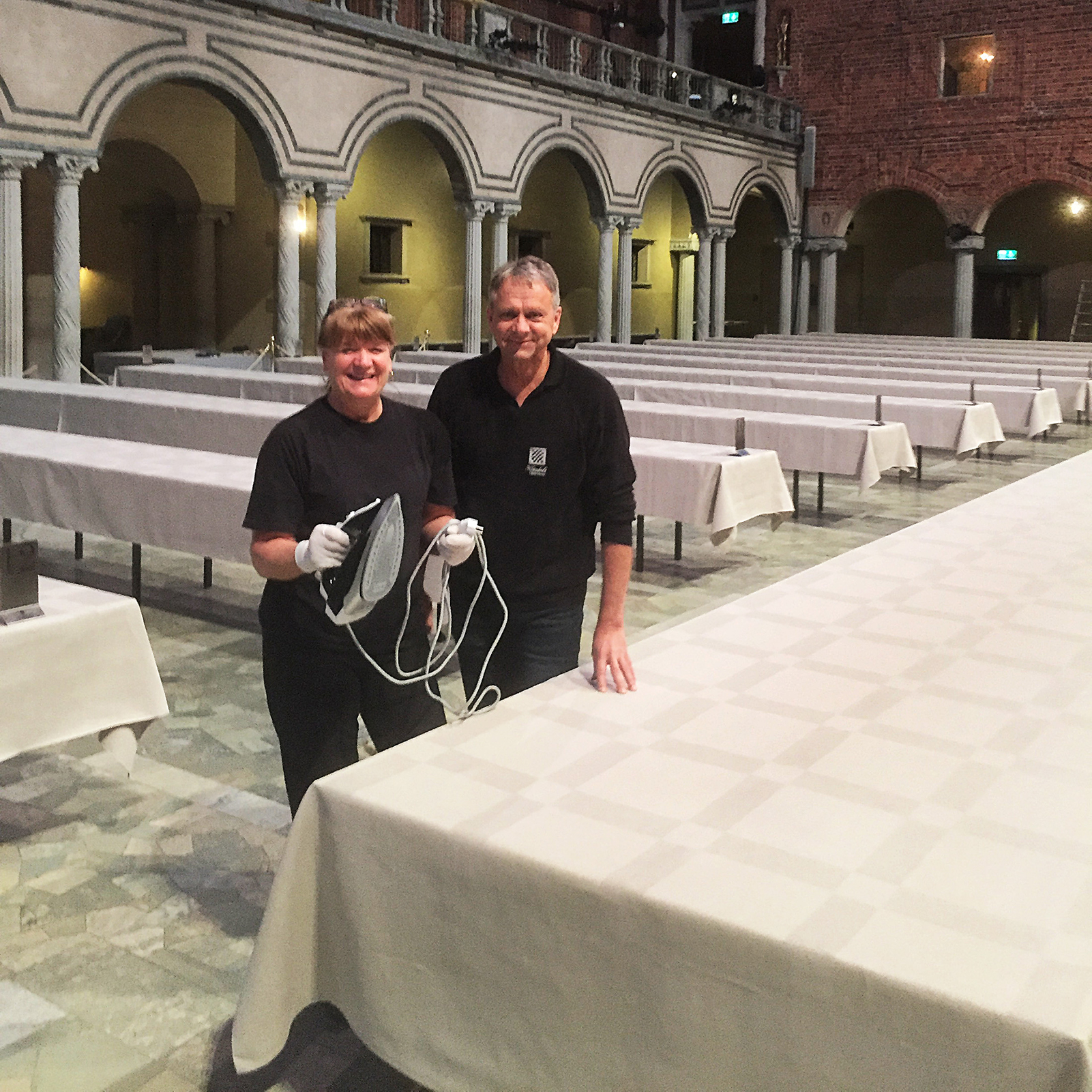 Över tusen gäster är inbjudna och får under kvällen avnjuta en middag av finaste slag vid vackert dukade bord. Klässbols Linneväveri bidrar med 500 meter duk och 1350 generösa servetter som mäter hela 70×70 cm. Allt såklart i ädlaste lin.